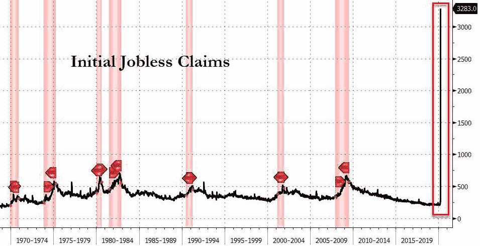Экономика США рушится. За одну неделю было зарегистрировано 3,3 млн. заявлений на пособие по безработице. Это в 2 раза больше прогноза. И в 4 раза больше, чем при любом другом экономическом кризисе.